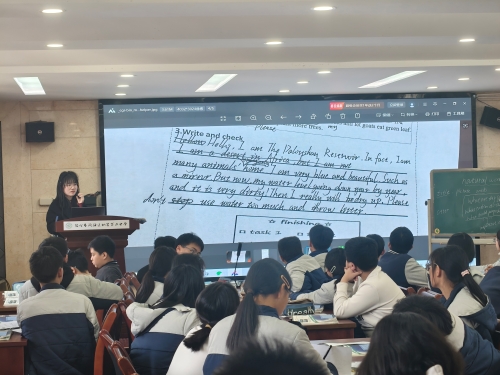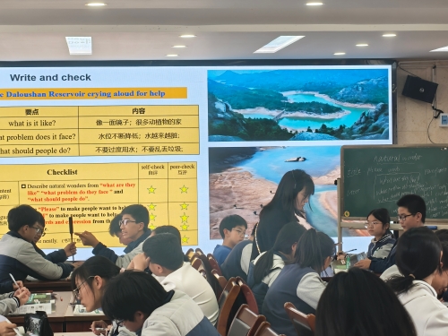 在题为“Natural Wonders Crying Aloud for Help”七下U5以读促写课中,李丽新老师聚焦写作技巧,从写作手法入手,引导学生重点赏析第一人称、please等的使用,穿插互动环节,激发学生的参与热情。在技能迁移环节,学生通过文本改写即时运用所学写作手法。最后,李老师立足本土化教学理念,选取学生熟悉的大罗山水库作为写作素材,将课堂所学与生活实际有机融合,既巩固了语言技能,又培养了学生的环境保护意识,诠释了"以学生发展为中心"的现代教学理念。