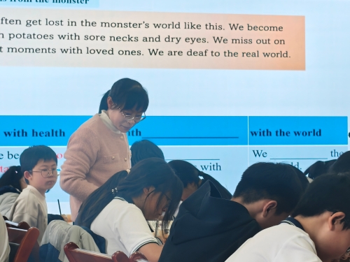胡笑鸥老师呈现了一节以"The time-eating monster"为主题的七下U4以读促写示范课。在本节课中,胡老师深度融合AI技术赋能英语教学,通过AIGC技术辅助完成教学设计流程,巧妙运用各类智能软件生成包括教学视频、可视化图片及思维导图在内的多元化教学资源。课堂实施环节,胡老师引导学生开展深度文本解读,通过问题链设计层层推进,引领学生由表及里地剖析文本结构,系统提炼出三个梯度的写作策略。在产出环节,创新设计了文本补全、关键词写作及语篇改写等递进式教学活动,实时检测学生的学习成效,为观摩教师展示了智慧课堂的典范案例。