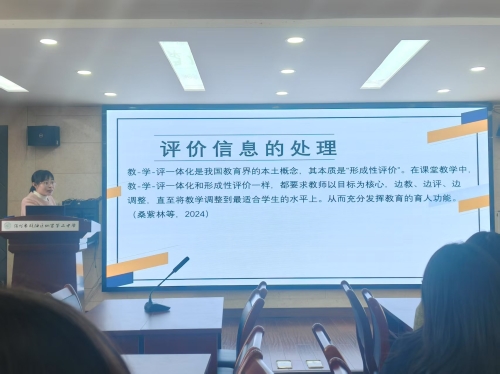 课后研讨环节,胡老师以“数智时代背景下'教学评'一体化设计与实施”为题开展专题讲座。基于逆向教学设计理念,胡老师结合自身丰富的教学实践,系统阐释了"以终为始"的教学设计路径:首先要确立指向英语学科核心素养的学习目标,其次开发与之匹配的评价任务体系,最后设计嵌入评价的教学活动。特别值得一提的是,胡老师现场介绍了AIGC技术在教学准备中的创新应用,包括智能文本生成和图像创作等实用工具的操作示范,为青年教师提供了AI赋能教学的具体实施策略,开拓了数字化教学的新视野。