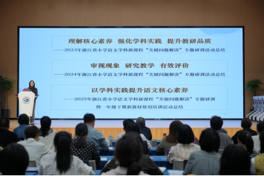 浙江省教育厅教研室小学语文教研员余琴作《以学科实践提升语文核心素养》的活动总结。余老师从本次活动主题出发,通过“从课例看语文实践活动”和“立足学情改进学教方式”两个方面进行全面梳理。她结合具体课例,提出“识字与写字”要真落实,注重联系学生经验和语境中识字,保障持续写字时间;“阅读与鉴赏”要明晰阅读能力的要素与层级,在学生读熟课文的基础上,把理解性阅读发展为鉴赏性阅读;“表达与交流”要联系学生丰富的生活体验,创设真实的语言运用情境,表达真情实感;“梳理与探究”应融合在其他三个语文实践活动之中,重在引导学生学会学习。同时,余老师提醒教师要重视研究学情,通过准确把握学生的学习难点,提高教学的针对性;遵循学生的学习规律,立足学习需求,采用适恰的教学方式,教学需要返璞归真。最后,余老师希望浙江小语全体同仁能够继续以饱满的激情投入教研,努力落实课标、研究学情、用好教材。