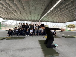 活动第一阶段,吴光辉老师以饱满的热情和专业的素养开启教学。课程伊始,他通过生动有趣的讲解和示范,向学生们详细介绍了立定跳远的基本动作要领以及弹力带辅助练习的原理和优势。在讲解过程中,吴老师语言简洁明了、通俗易懂,配合着标准规范的动作示范,让学生们迅速对课程内容有了初步的认识。