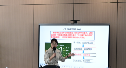 第一节课由来自瓯海二外的周维婷老师带领一(3)班学生共同学习《动物王国开大会》,周老师以 “动物王国发布会” 为情境载体,通过 “狗熊发布的通知包含哪些关键信息”“根据通知能否准确找到大会现场”“通知为何反复出错” 等层层递进的问题,引导一年级学生在角色扮演与文本对话中,领悟 “有序表达” 的核心价值。课堂上,孩子们化身 “小主播”,在修正通知的实践中,自然习得 “提取关键信息”“逻辑梳理” 的思维方法,生动展现了低段思辨能力培养的趣味性与可行性。
