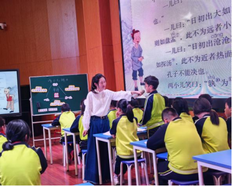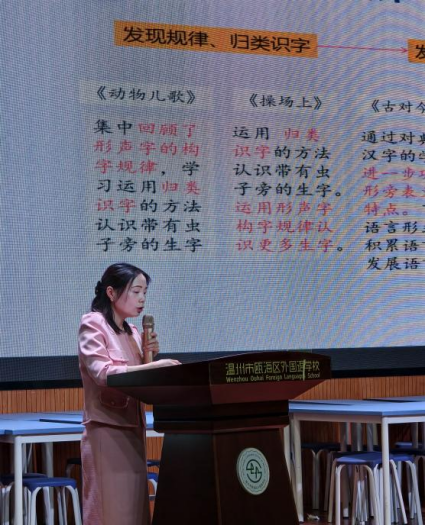 活动首场课例展示中,瓯海区外国语学校朱玮炜老师执教六年级《两小儿辩日》。课堂以开展榉园辩论会,争当金牌辩手为任务情景。在读通读懂文言文的基础上,借助表格,梳理两下儿辩斗的观点、理由和角度,并探寻辩论方法。课堂上。朱老师引导学生从文本细节中提炼论据,在角色扮演中体验思辨魅力,将文言文学习与逻辑思维训练有机融合,展现了单元整体教学中“任务驱动””的实践智慧。