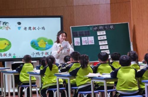 下午的活动,先由金全全老师执教《动物儿歌》一课。金老师的教态亲切大方,语言活泼生动,孩子们都沉醉其中。金老师通过词卡等教具,结合动作演示如“捉迷藏”,将儿歌中的动物行为具象化,符合低年级学生以形象思维为主的特点,增强了课堂趣味性。同时,金老师关注文本的语言范式积累,通过问答互动,如“蝴蝶哪里捉迷藏?”等方式调动学生参与,课堂氛围活跃,学生主体性得到体现。课堂上,孩子们跟着金老师的引导充分地朗读课文,理解形声字的特点,并结合自己的生活经验不断积累生字,习得语言,体现了语文基础能力的培养。