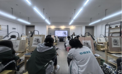 张建钗老师的美术课堂则聚焦静物素描的质感突破。针对不锈钢特性,他提炼出“转折要‘硬’、暗部要‘狠’、高光要‘利’”的实战口诀,直击核心技法。创新的“揉擦技法”分层递进练习,配合创新的“美术加AI”软件实时画面分析,将“擦暗不擦亮,揉虚不揉实”的抽象技法转化为即时可见的技术调整,为静物素描注入科技助力下的精准质感。