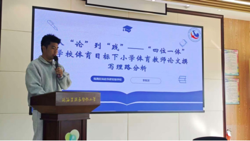 在接下来的讲座环节中,李知洋老师带来了题为《从“论”到“践”——“四位一体”学校体育目标下的小学体育教师论文撰写理路分析》的专题讲座。李老师结合自身丰富的科研经验,围绕资料查找、论文选题、框架搭建、素材积累等关键环节展开深入剖析。他特别指出,小学体育教师的论文写作应立足课堂实践,紧扣“四位一体”学校体育目标,从日常教学的小问题、小妙招中挖掘研究切入点,将教学实践中的所思所悟转化为有价值的科研成果。讲座内容兼具理论高度与实践指导意义,为在场教师解开了论文写作的困惑。