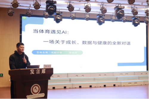 评课结束后,经验交流环节干货满满。首先来自苍南县第二实验小学陈传奇老师以《当体育遇见AI:一场关于体育、数据与健康的全新对话》为题,分享了AI技术如何破解传统体育教学中“数据静态孤立、关注难以覆盖 ”的痛点,让每一位学生的运动状态与努力过程都被看见;