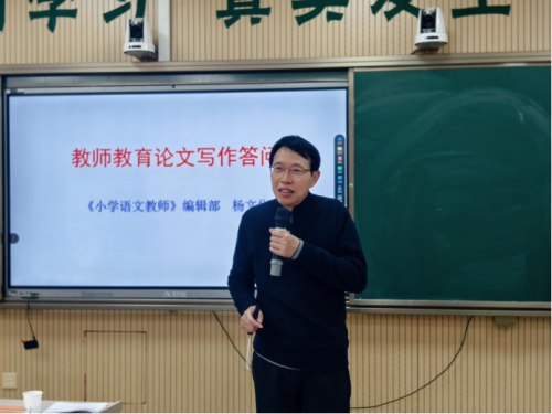 然后,《小学语文教师》杂志社主编、中国语文报刊协会名师专业发展研究会副秘书长杨文华为我们带来了专题讲座《教师教育论文写作答问》。杨主编指出,作为老师,一要提升阅读量,二要提高自己的专业写作能力。在讲座中,杨主编围绕教育论文写作的核心问题,展开了系统深入的讲解。首先,他区分了教育叙事、案例的记叙文风格与教学论文、课堂的议论文特质,强调写作前需大量阅读以构建扎实的理论根基,并培养精准的梳理能力。然后从论文的涵义、特征、结构三个角度,帮助老师梳理论文写作的底层逻辑。杨主编提出,论文是以说理为主基本属性的,主要是为以理服人。在解析教育论文的特征时,杨主编以一篇论文的开头部分为例,指导老师们如何清晰界定核心概念、阐述其功能与意义,并构建与研究内容的逻辑关联。同时指出,论文具有“问题性、专题性、理论性、结构化”等几个基本特征,并对每个特征进行了详尽的说明。针对论文类型,他详细阐述了经验总结、学术论文与研究报告的区别,强调学术论文需以数据为支撑,体现研究的科学性与严谨性。随后,杨主编杨主编围绕论文选题的含义与选题角度展开指导。指出在进行论文选题时,可以从热点问题、教学实践的成功经验、引导实践的理论观念和文献资料的整理归纳这四个方面进行选择。关于论文的撰写,杨主编在论文的命题、结构和格式上向大家传授了不一样的经验。论文的命题要做到切入口大小适宜、用术语表达关键内容、尽量避免使用描绘性的语言、主题词集中、题目有思维焦点和新颖感。一个个真实生动的改题案例,让老师们受益匪浅。不仅帮助老师思考,如何挖掘有价值的议题,还为老师们提供了丰富的写作灵感与方向指引。