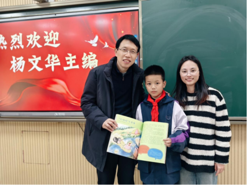 接着,杨文华主编为第一届“自写自画”创作大赛获奖的孩子送上了精心准备的《我爱自写自画——首届小学生“自写自画”创绘作品展评活动集锦》书刊,并与朱昔和同学亲切合影,定格了这一温馨而意义非凡的时刻。杨主编不仅对孩子的创作才华给予了高度评价,还鼓励他们继续保持对写作与绘画的热爱。