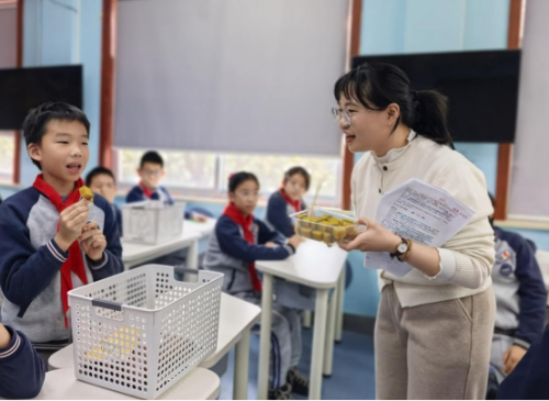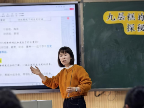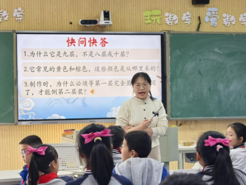 随后,瓯海区实验小学教育集团慈湖校区姚鸿婧老师带来第二节展示课《非遗里的美食之九层糕——小学五年级传统美食里的文化主题班会》。姚老师从地方非遗美食“九层糕”入手,带领学生通过实践观察、文化溯源、动手体验等方式,感受食物背后承载的历史记忆与文化意义。课堂兼具趣味性与教育性,生动诠释了“文化浸润生活,教育回归真实”的班会设计思路。